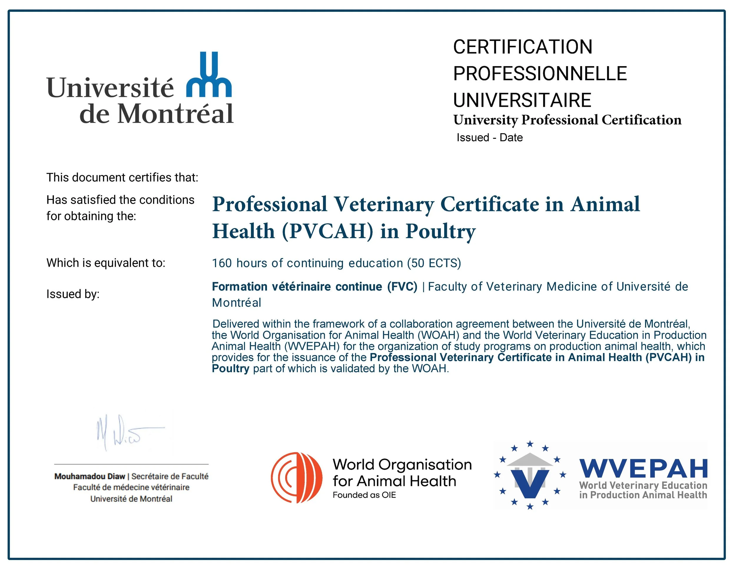 The World Veterinary Education in Production Animal Health (WVEPAH) Professional Certificate in Animal Health: Poultry, Swine Production or Aquaculture health management is awarded in accordance with the Université de Montréal’s requirements and standards.